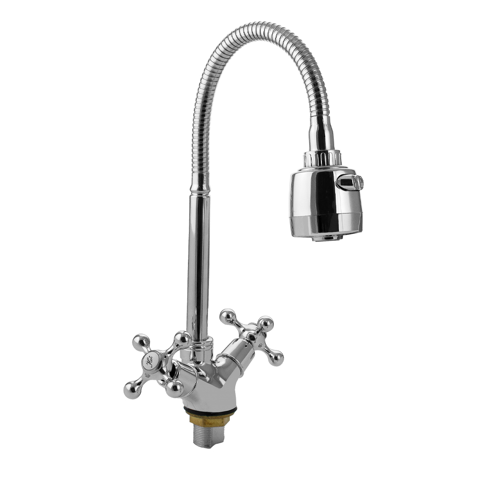 Смеситель для кухонной мойки и раковин, массивный корпус с гибким изливом, хромированный, с двухрежимным аэратором для экономии воды. Материал изготовления — ЦАМ (цинк-алюминий-медь) + нержавеющая сталь. Крепление резьба - гайка. Кранбукса м/к 1/2, ручка крест, поворот на 90˚. Габаритные размеры: высота 280 - 340 мм, длина 180 - 230 мм, диаметр посадочного седла 45 мм, длина резьбы 35 мм, длина подводки 350 мм. Вес - 1,100 кг, объём - 0,00317 м3. В комплекте корпус с изливом, паспорт, подводка 1/2, крепёж.