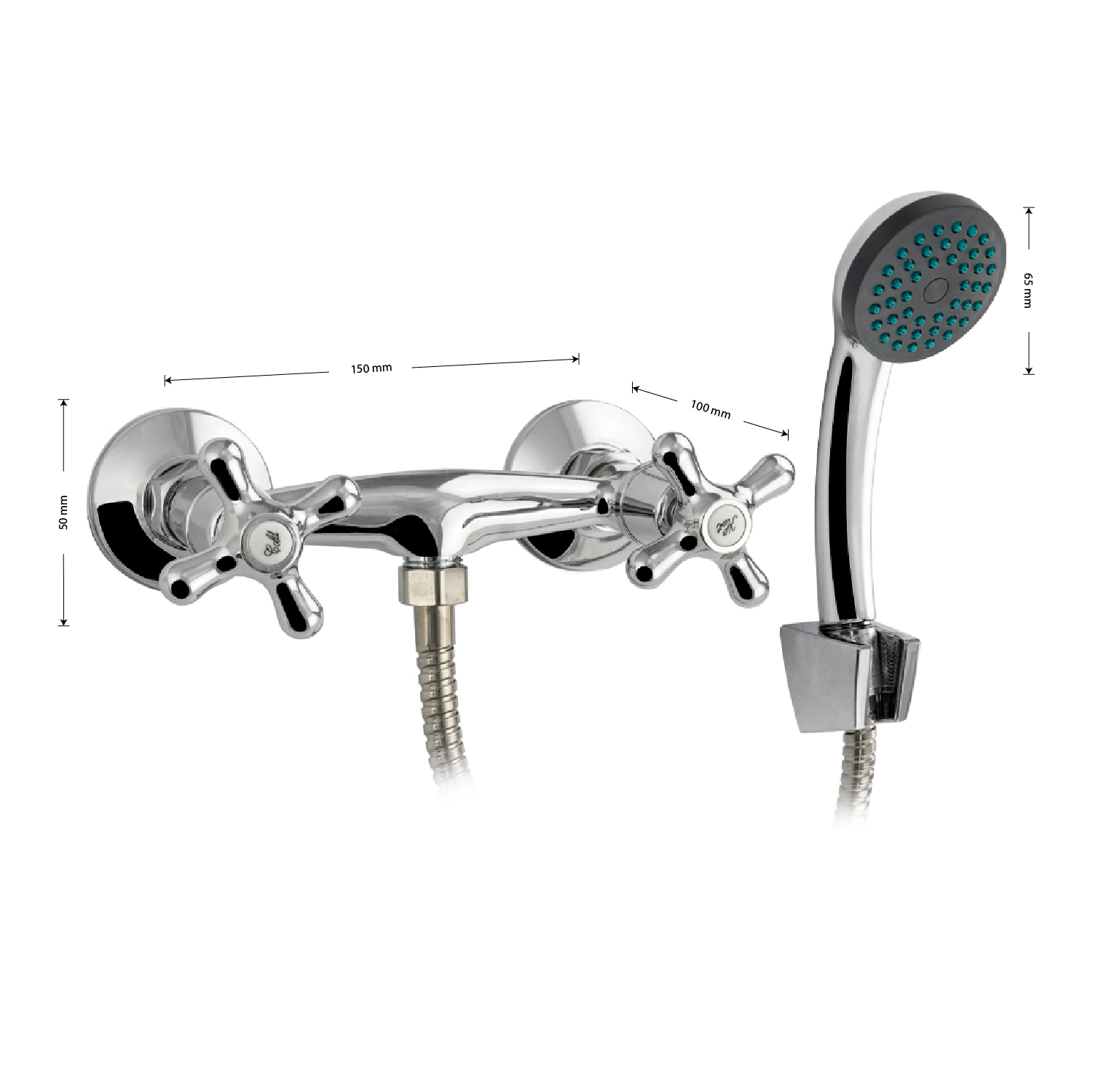 Смеситель хромированный в ванную/душевую комнату без излива. Кранбукса металокерамика 1/2, поворот на 90˚, ручка крест, крепление к стене, чашки нержавеющая сталь, гайки и эксцентрики из нержавейки, душевая лейка. Габаритные размеры: ширина 150 мм, длина 100 мм, высота 50 мм, диаметр чашки 60 мм, диаметр лейки 65 мм. Вес - 0,900 кг, объём - 0,00384 м3. В комплекте корпус, паспорт, шланг 150 см, лейка, кронштейн, крепеж.