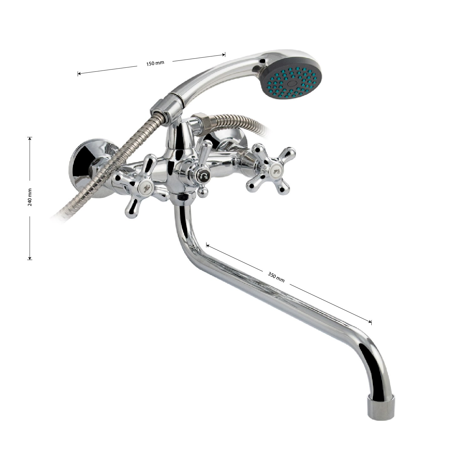 Смеситель хромированный в ванную/душевую комнату с длинным изливом. Материал изготовления — ЦАМ (цинк-алюминий-медь) + нержавеющая сталь. Кранбуксы металлокерамика 1/2, ручки крест поворот на 90˚. Дутый, большой корпус с шаровым переключением подачи воды, аэратор для экономии воды, подставка - "рога" для лейки, чашки нержавеющая сталь, гайки и эксцентрики из нержавейки. Габаритные размеры: ширина 150 мм, высота 240 мм, длина излива 350 мм, диаметр чашки 60 мм, длина шланга 150 см, лейка d = 65 мм. Вес - 1,300 кг, объём - 0,00364 м3. В комплекте корпус с изливом, паспорт, крепёж, прокладки, лейка, шланг.