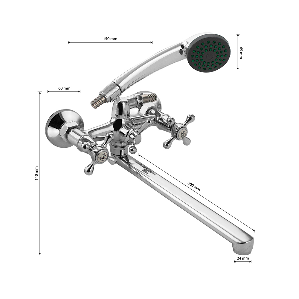 Смеситель хромированный, в ванную / душевую комнату с длинным плоским изливом. Материал изготовления — ЦАМ (цинк-алюминий-медь) + нержавеющая сталь. Кранбуксы металлокерамика 1/2, ручки крест, поворот на 90˚. Дутый, большой корпус с шаровым переключением подачи воды, аэратор для экономии воды, подставка - "рога" для лейки, чашки, гайки и эксцентрики из нержавеющей стали. Габаритные размеры: ширина 150 мм, высота 140 мм, длина излива 300 мм, диаметр чашки 60 мм, длина шланга 150 см, лейка d = 65 мм. Вес - 1,400 кг, объём - 0,00529 м3. В комплекте корпус с изливом, паспорт, крепёж, прокладки, лейка, шланг.