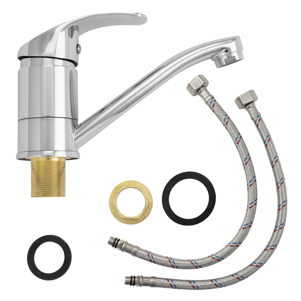 Смеситель для кухонной мойки и раковины, хромированный, с коротким, поворотным изливом, шаровый, литая ручка. Материал изготовления — ЦАМ (цинк-алюминий-медь) + нержавеющая сталь. Крепление резьба - гайка, картридж d = 40 мм. Аэратор для экономии воды. Габаритные размеры: высота 115 мм, длина 190 мм, длина излива135 мм, диаметр посадочного седла 50 мм, длина резьбы 40 мм, длина подводки 350 мм. Вес - 0,800 кг, объём - 0,00194 м3. В комплекте паспорт, корпус, подводка 1/2, крепеж, набор прокладок.