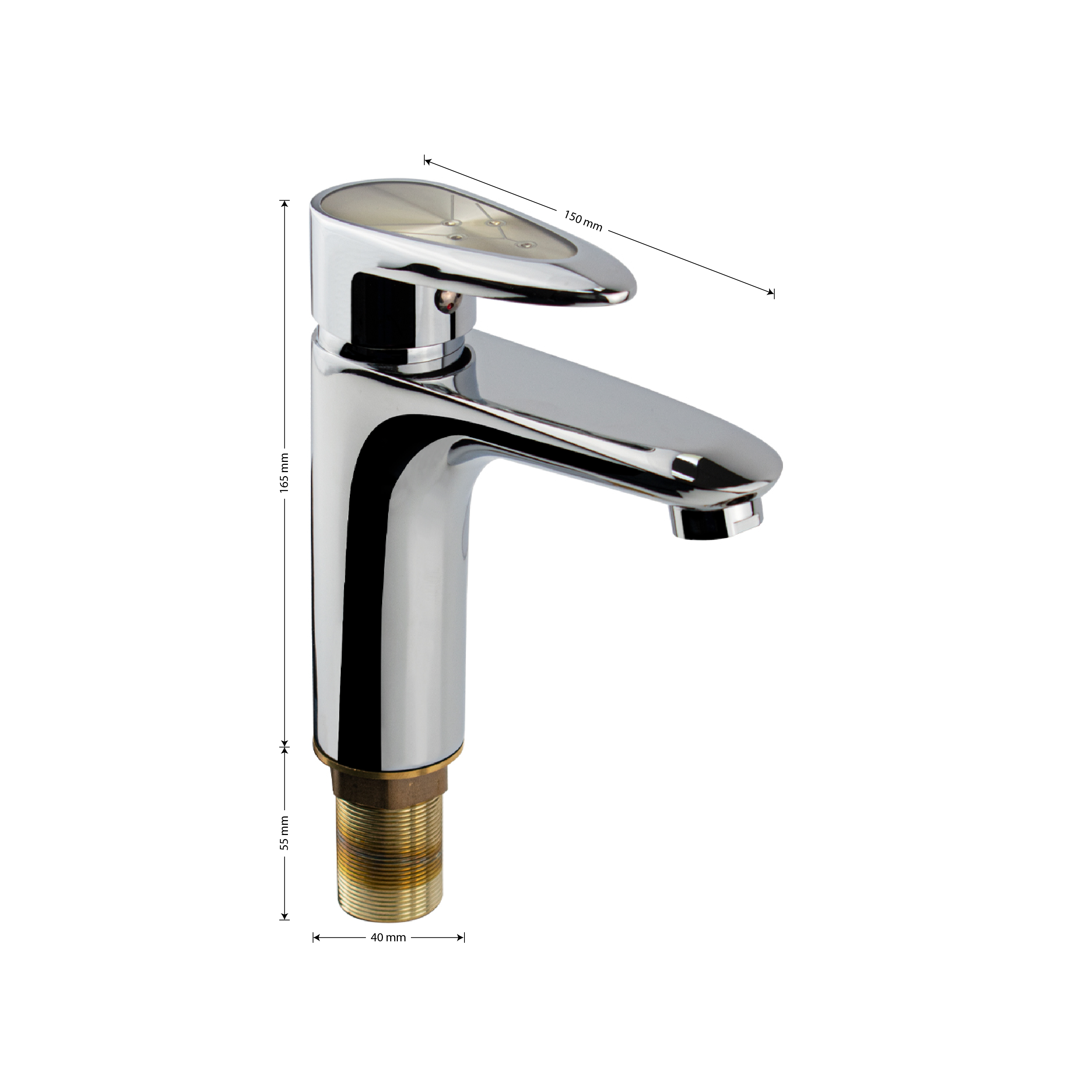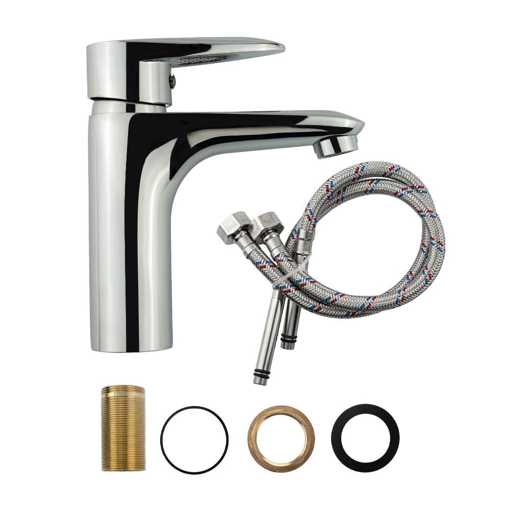 Смеситель для раковины, сатеновая ручка с узором, шаровый. Материал изготовления — ЦАМ (цинк-алюминий-медь) + нержавеющая сталь, хромированный, с коротким изливом, литой корпус, литая ручка, шаровый. Крепление резьба - гайка, картридж d = 35 мм. Аэратор для экономии воды. Габаритные размеры: высота 165 мм, длина 150 мм, длина излива 105 мм, диаметр посадочного седла 40 мм, длина резьбы 55 мм, длина подводки 500 мм. Вес - 1,12 кг, объём - 0,00201 м3. В комплекте паспорт, корпус, подводка 1/2, крепеж, набор прокладок.