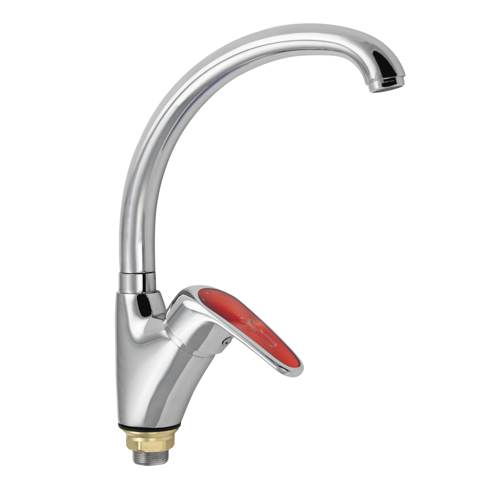 Смеситель для кухонной мойки и раковин, корпус хромированный, боковой, с высоким С-образным изливом, шаровый. Материал изготовления — ЦАМ (цинк-алюминий-медь) + нержавеющая сталь. Крепление резьба - гайка, картридж d = 40 мм, красная ручка с узором. Аэратор для экономии воды. Габаритные размеры: высота 290 мм, длина 250 мм, диаметр посадочного седла 50 мм, длина резьбы 30 мм, длина подводки 400 мм. Вес - 1,200 кг, объём - 0,00490 м3. В комплекте паспорт, корпус с изливом, подводка 1/2, крепеж, набор прокладок.