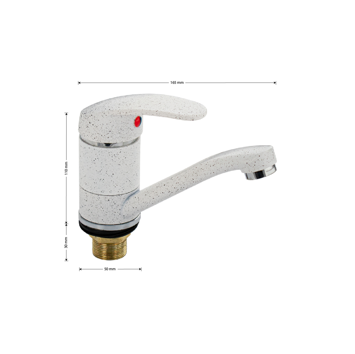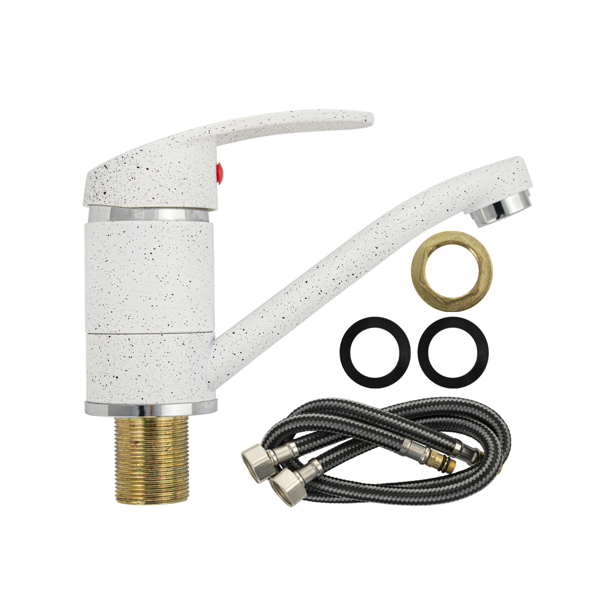 Смеситель для кухонной мойки и раковины, белый, с поворотным изливом 15 см, шаровый. Из нержавеющей стали и алюминия. Крепление резьба - гайка, картридж d = мм. Аэратор для экономии воды. Габаритные размеры: высота 110 мм, длина 165 мм, диаметр посадочного седла 50 мм, длина резьбы 45 мм, длина подводки 400 мм. Вес - 0,56 кг, объём - 0,00182 м3. В комплекте паспорт, корпус, подводка 1/2, крепеж, набор прокладок.