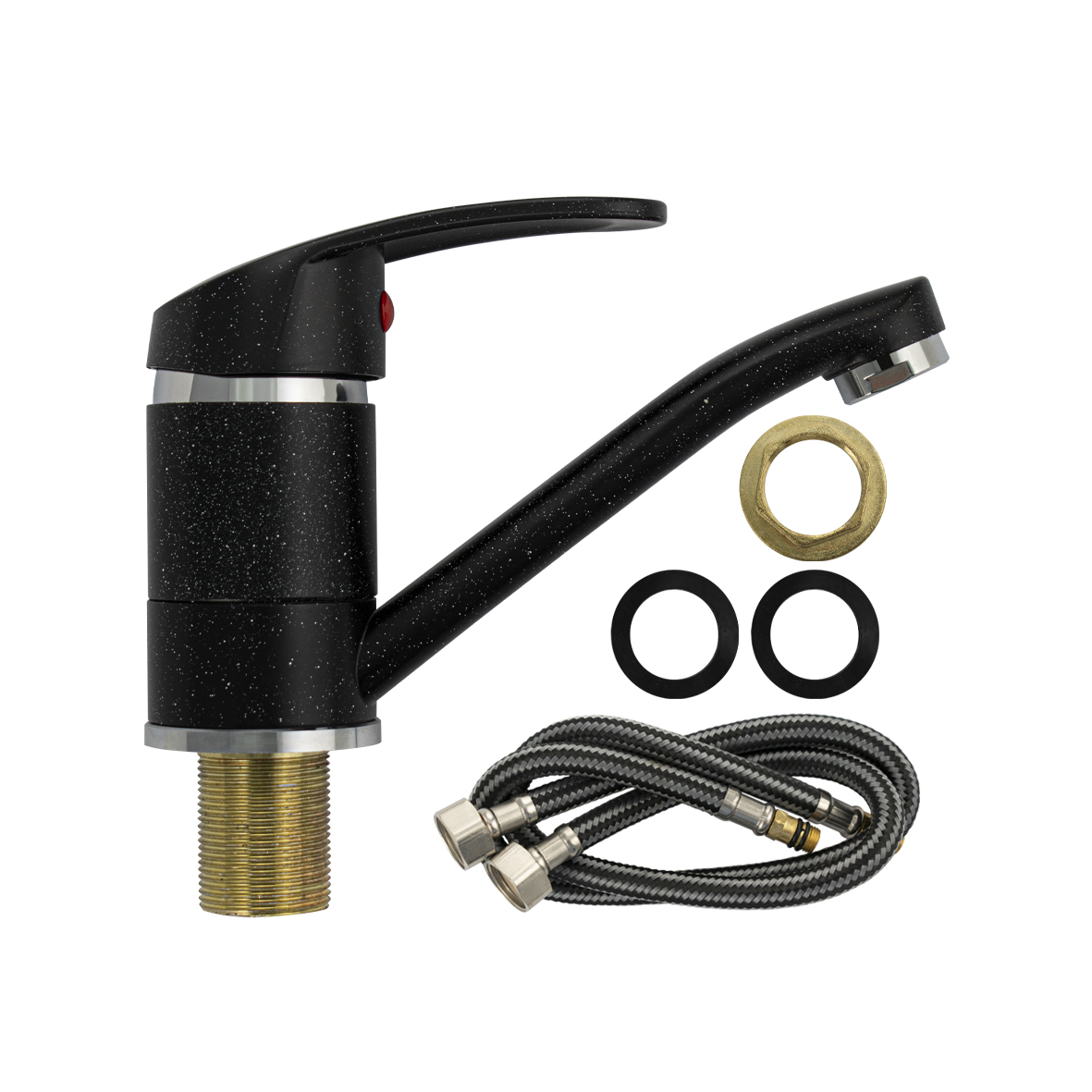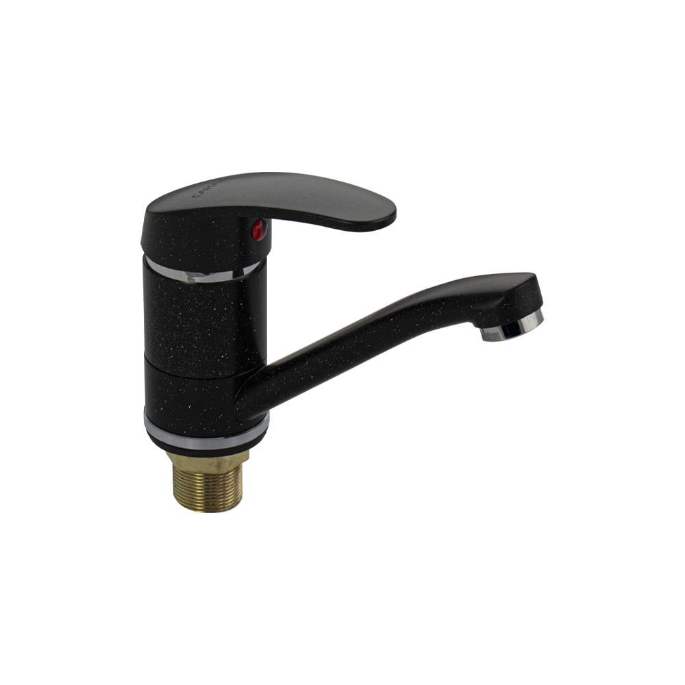 Смеситель для кухонной мойки и раковины, черный, с поворотным изливом 15 см, шаровый.Из нержавеющей стали и алюминия. Крепление резьба - гайка, картридж d = мм. Аэратор для экономии воды. Габаритные размеры: высота 110 мм, длина 165 мм, диаметр посадочного седла 50 мм, длина резьбы 45 мм, длина подводки 400 мм. Вес - 0.56 кг, объём - 0.00182 м3. В комплекте паспорт, корпус, подводка 1/2, крепеж, набор прокладок.