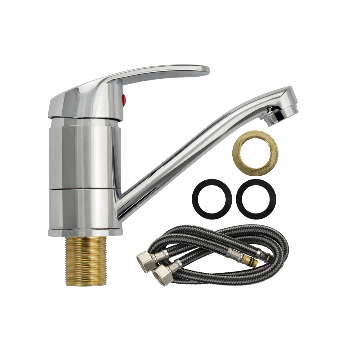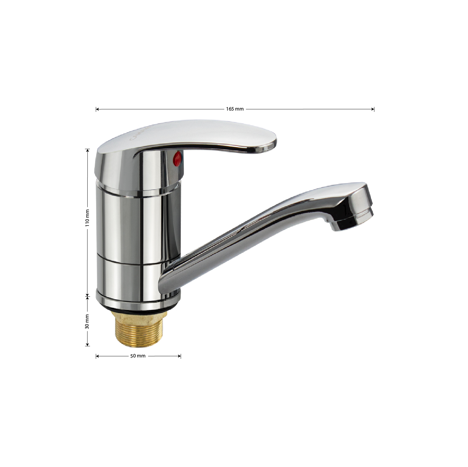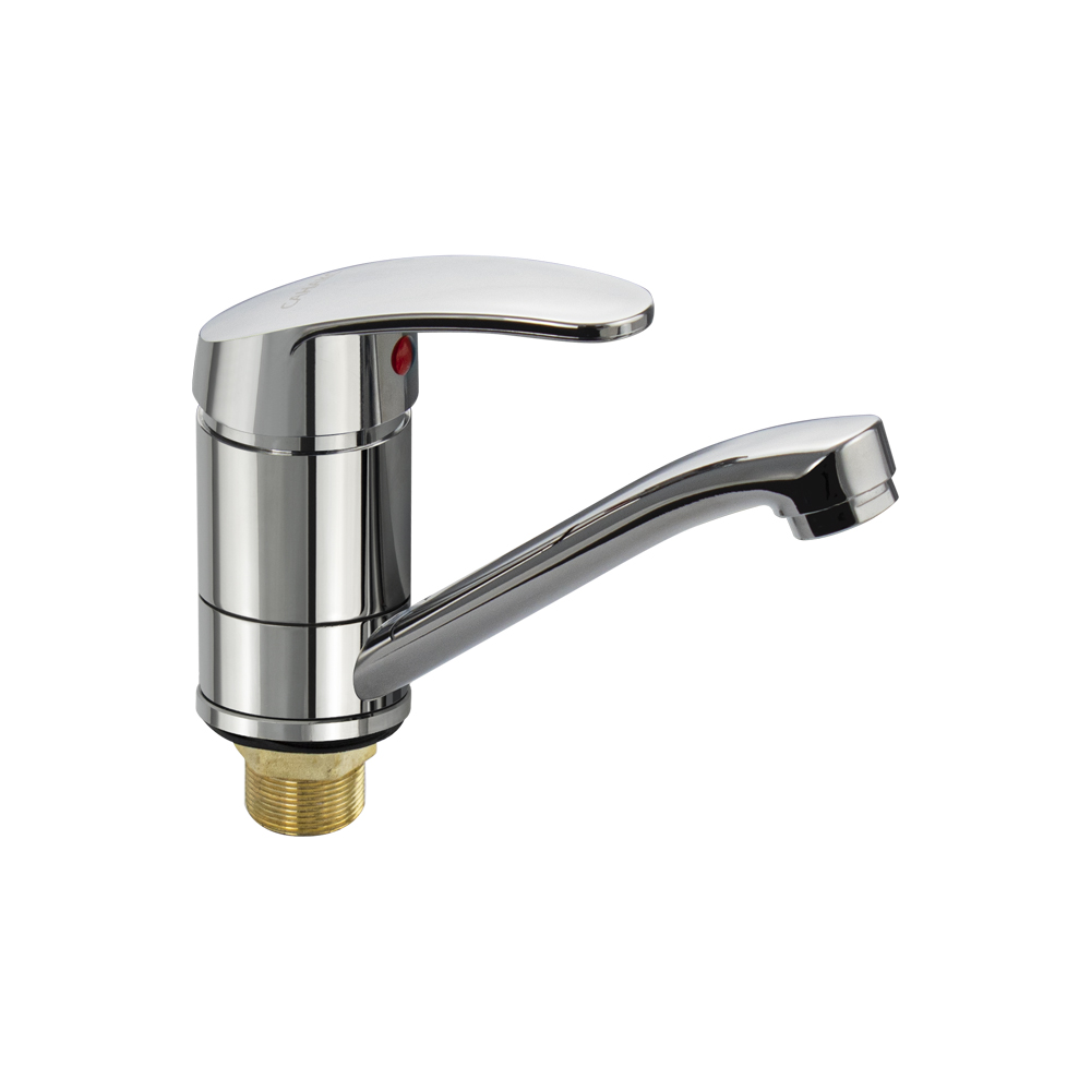 Смеситель для кухонной мойки и раковины, хромированный, с поворотным изливом 15 см, шаровый. Из нержавеющей стали и алюминия. Крепление резьба - гайка, картридж d = мм. Аэратор для экономии воды. Габаритные размеры: высота 110 мм, длина 165 мм, диаметр посадочного седла 50 мм, длина резьбы 45 мм, длина подводки 400 мм. Вес - 0.56 кг, объём - 0.00182 м3. В комплекте паспорт, корпус, подводка 1/2, крепеж, набор прокладок.