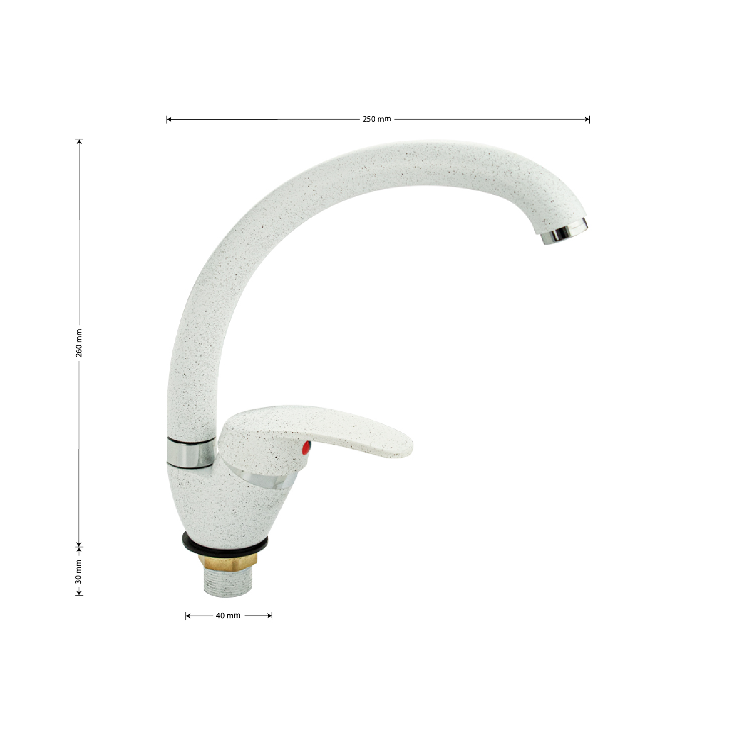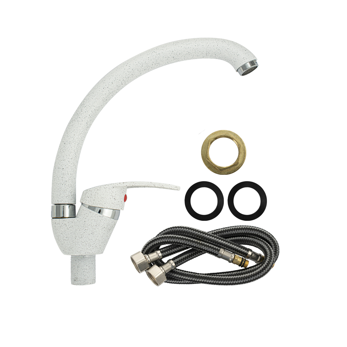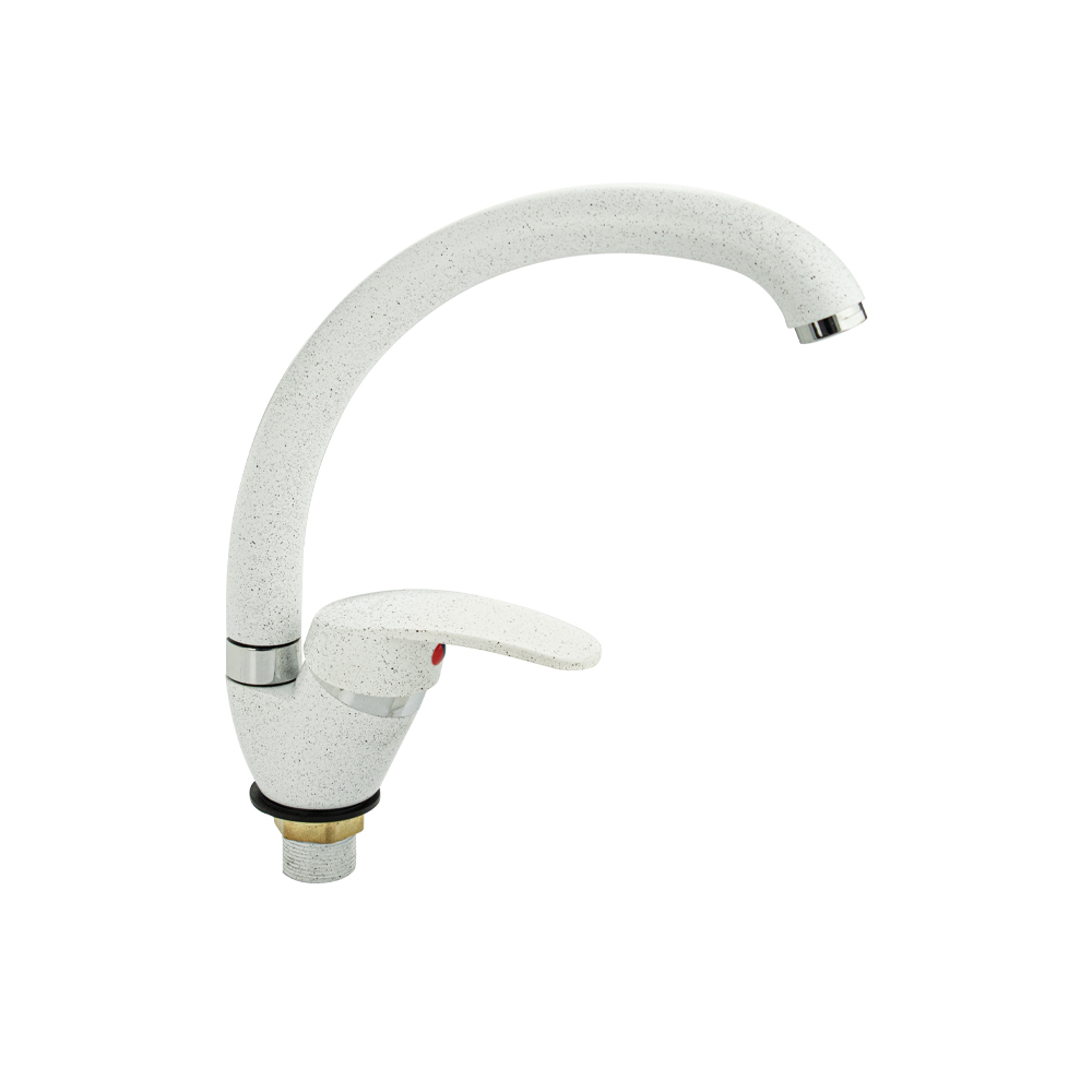 Смеситель для кухонной мойки и раковин, литой матовый корпус, из нержавеющей стали и аллюминия, с С - образным изливом, шаровый. Цвет белая эмаль с вкраплениями. Крепление резьба - гайка, картридж d = мм, ручка литая. Аэратор для экономии воды. Такая модель может использоваться на домашней кухне, на даче, в медицинских учреждениях и общественных местах. Габаритные размеры: высота 260 мм, длина 250 мм, диаметр посадочного седла 40 мм, длина резьбы 30 мм, длина подводки 400 мм. Вес - 0,65 кг, объём - 0,00357 м3. В комплекте паспорт, корпус с изливом, подводка 1/2, крепеж, набор прокладок.