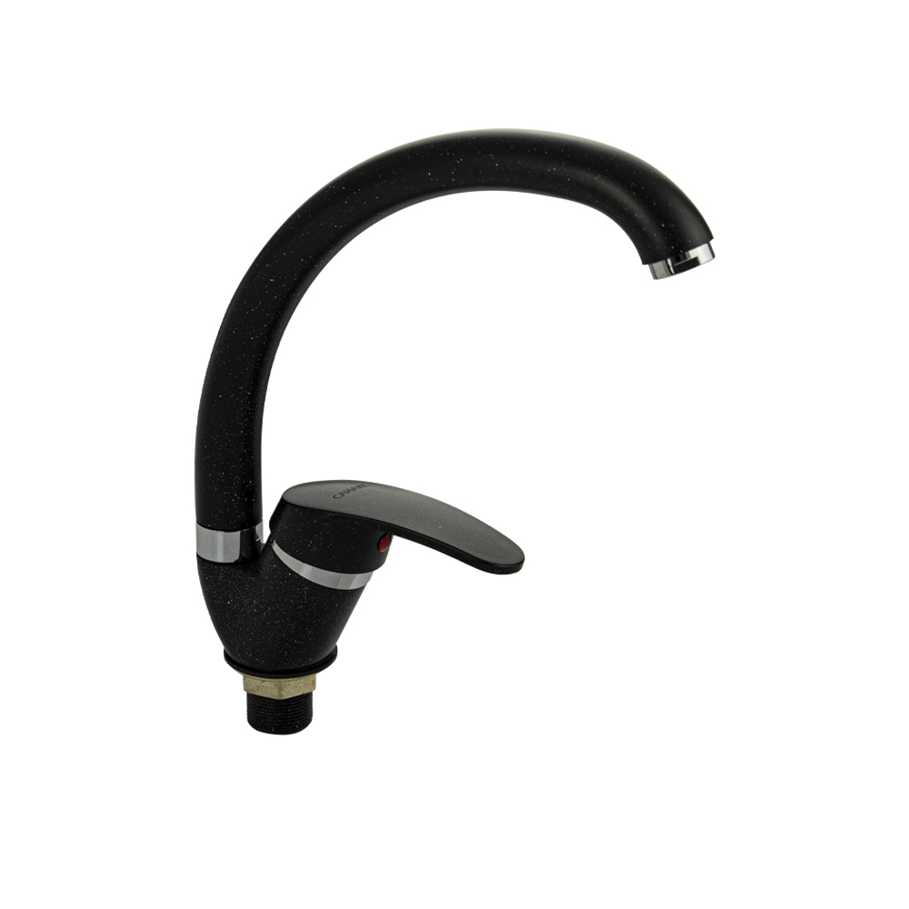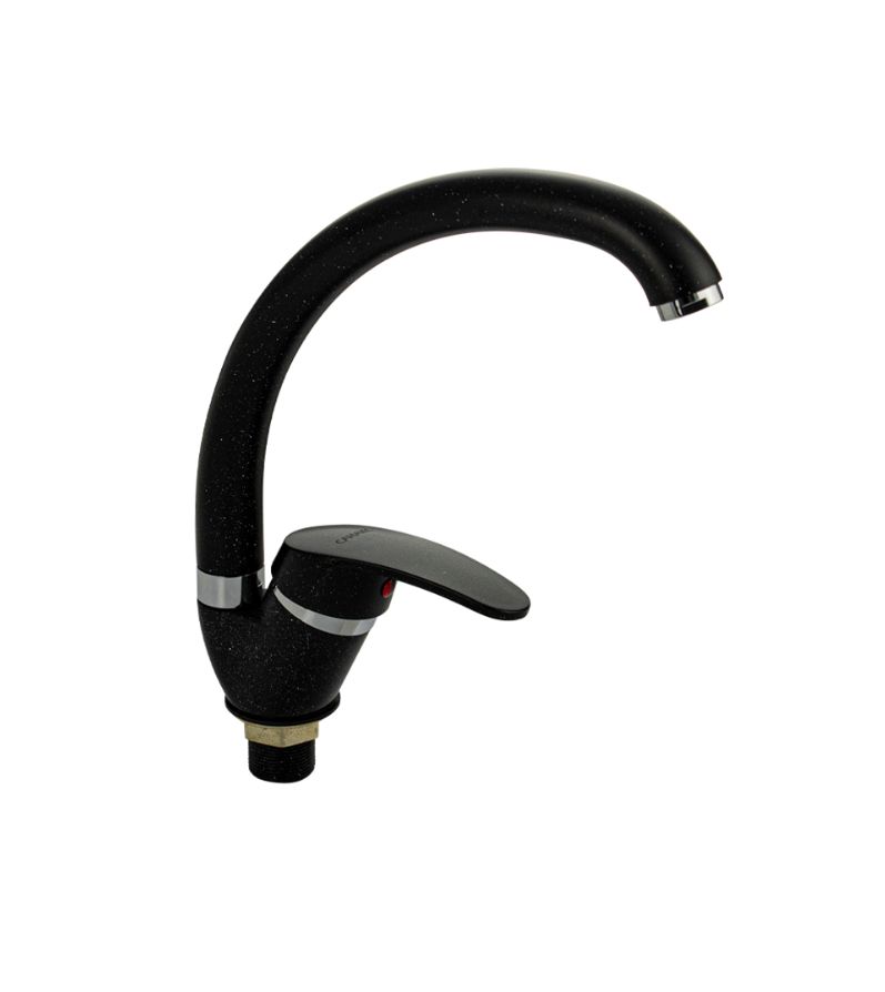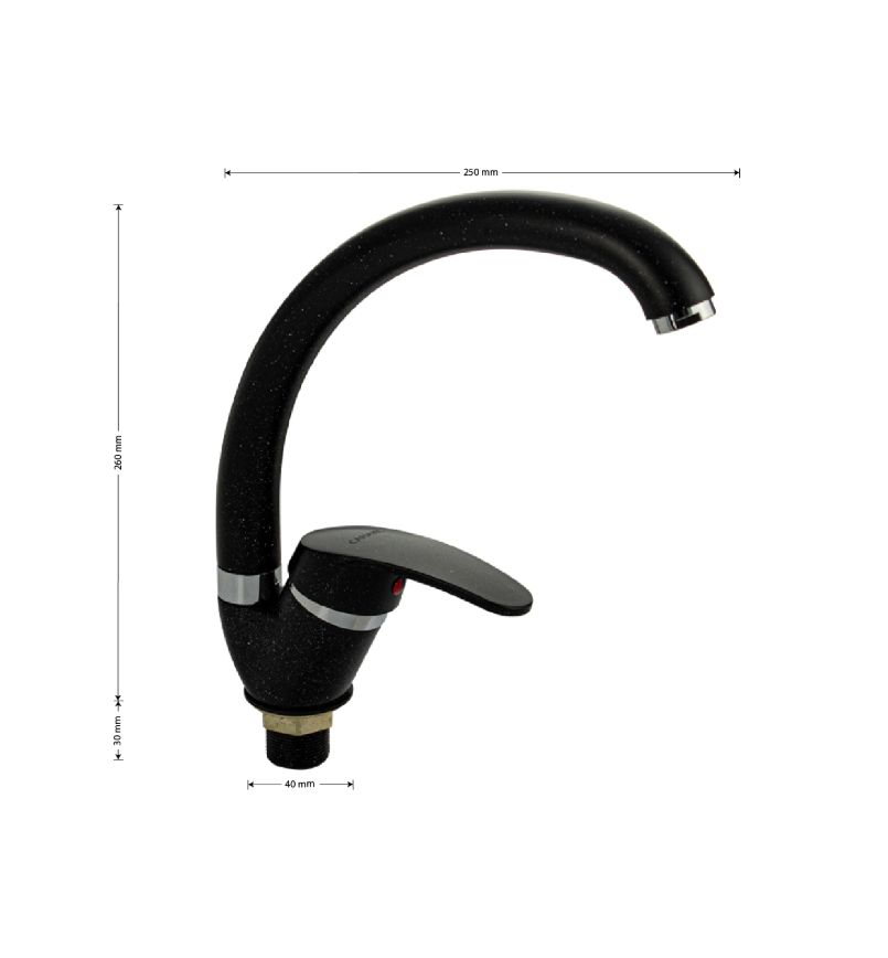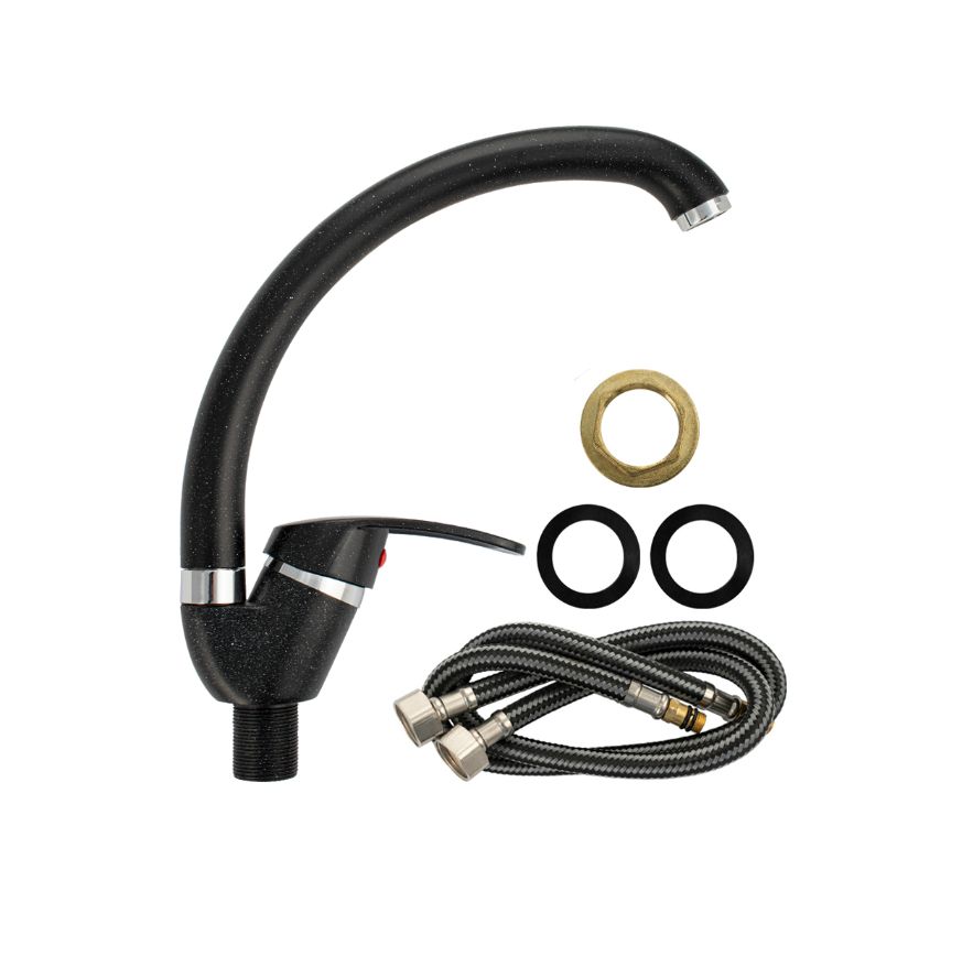Смеситель для кухонной мойки и раковин, литой матовый корпус, из нержавеющей стали и аллюминия, с С - образным изливом, шаровый. Цвет черная эмаль с вкраплениями. Крепление резьба - гайка, картридж d = мм, ручка литая. Аэратор для экономии воды. Такая модель может использоваться на домашней кухне, на даче, в медицинских учреждениях и общественных местах. Габаритные размеры: высота 260 мм, длина 250 мм, диаметр посадочного седла 40 мм, длина резьбы 30 мм, длина подводки 400 мм. Вес - 0,65 кг, объём - 0,00357 м3. В комплекте паспорт, корпус с изливом, подводка 1/2, крепеж, набор прокладок.