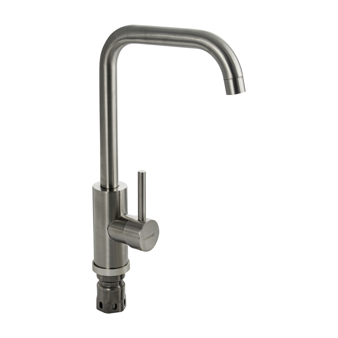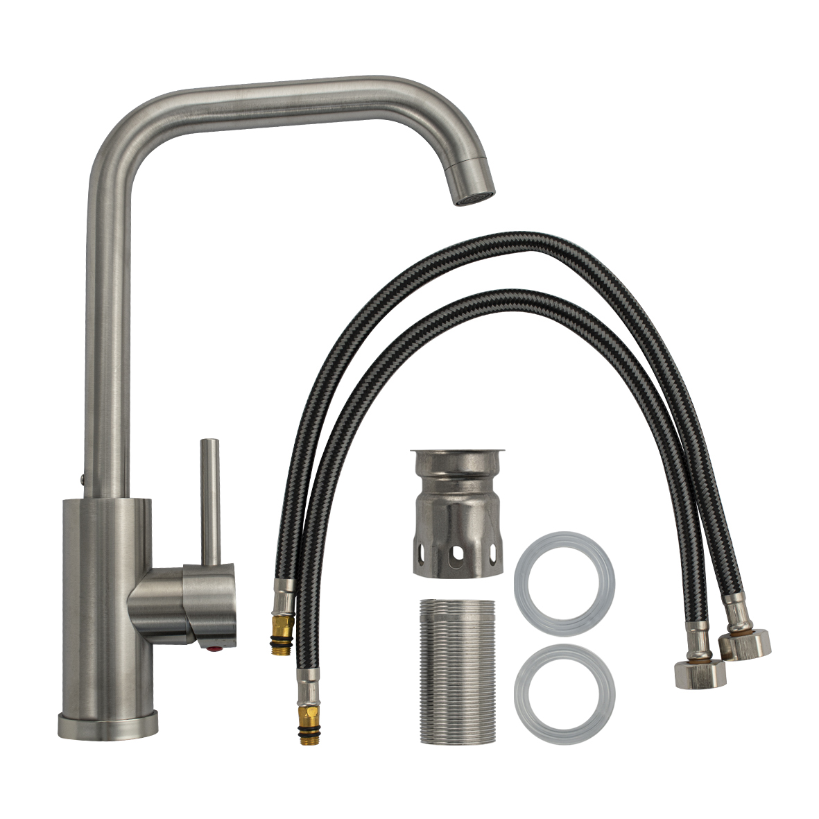 Смеситель для кухонной мойки и раковин, литой матовый корпус, из нержавеющей стали марки 304, с высоким П-образным изливом, шаровый, Крепление резьба - гайка, картридж d = 25 мм, ручка литая. Аэратор для экономии воды. Такая модель может использоваться на домашней кухне, на даче, в медицинских учреждениях и общественных местах. Габаритные размеры: высота 330 мм, длина 230 мм, диаметр посадочного седла 50 мм, длина резьбы 55 мм, длина подводки 500 мм. Вес - 1 кг, объём - 0.00516 м3. В комплекте паспорт, корпус с изливом, подводка 1/2, крепеж, набор прокладок.