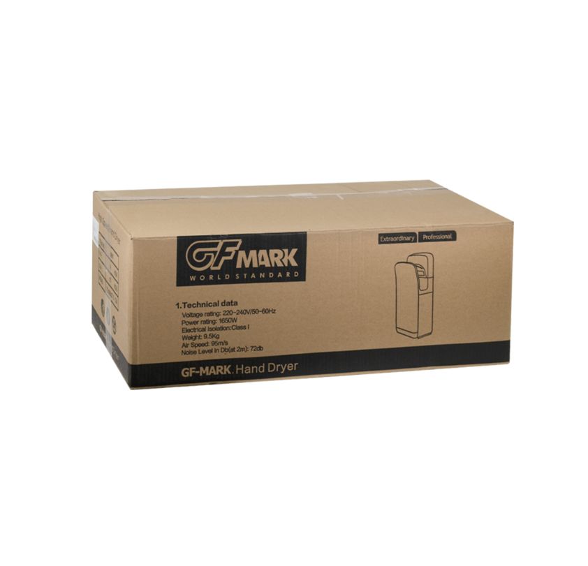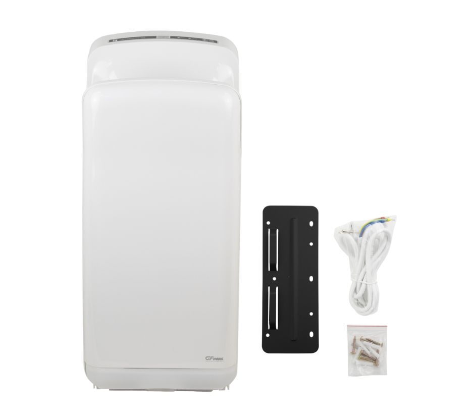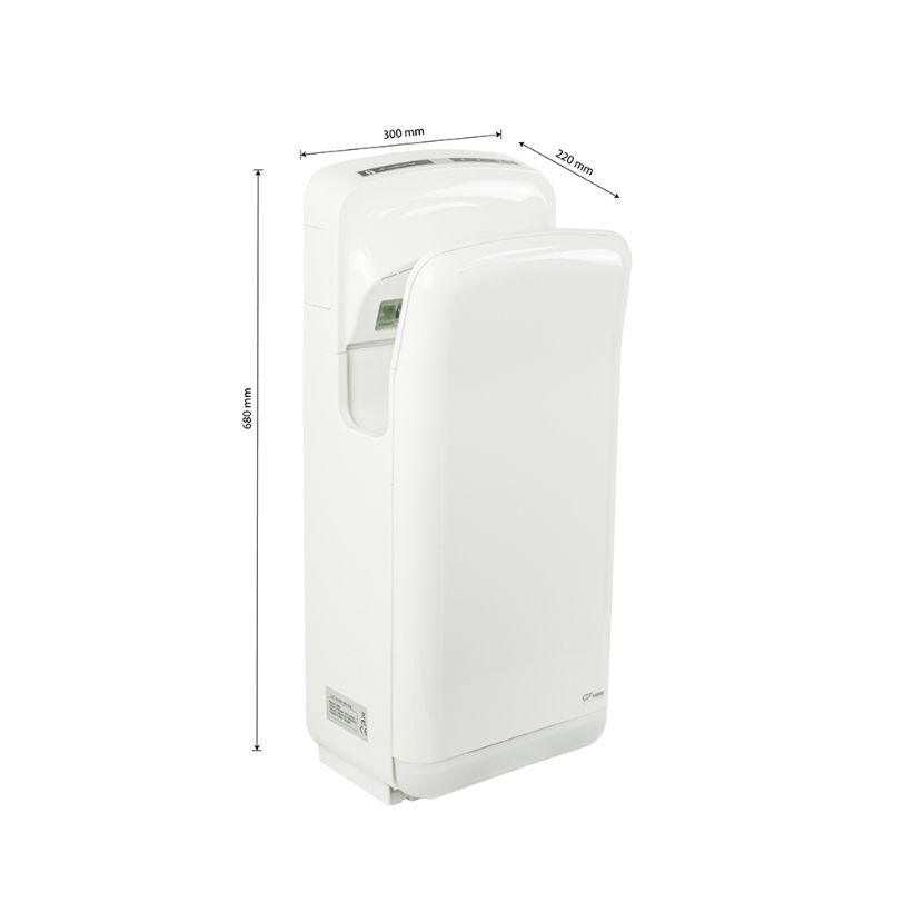 Сушилка для рук, скоростная, бизнес класса, цвет белый, погружная, пластик АБС, 1650Вт, 220В, 50Гц, время сушки 5-7 секунд , обороты 24000 в минуту, защита IPX4, температура потока 65 +15-15 градусов С, из пластика АБС, воздушный фильтр и фильтр HEPA, щёточный мотор. Габаритные размеры: высота 680 мм, ширина 300 мм, глубина 220 мм. Вес - 9,5 кг, объем - 0,08500 м3