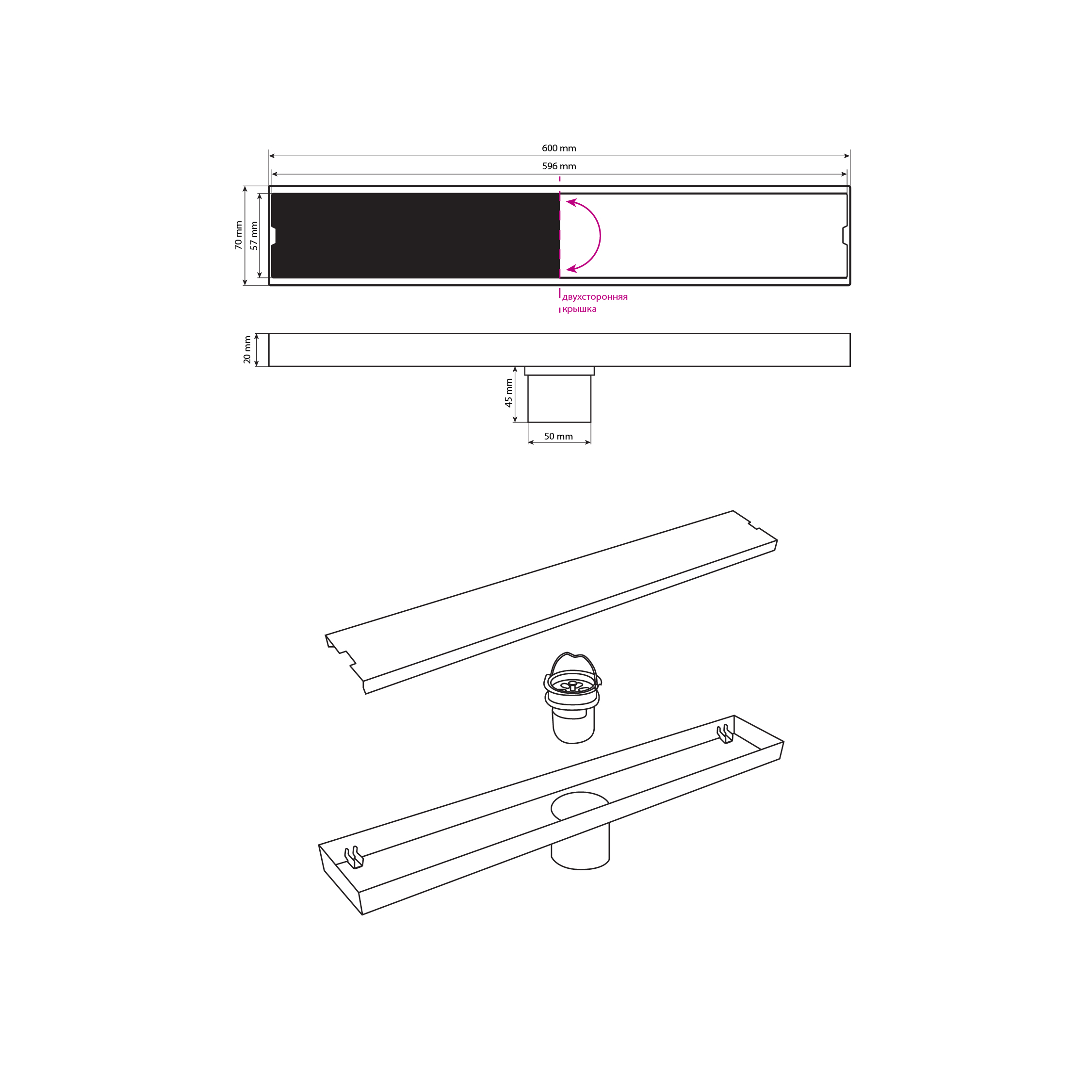 Душевой сливной трап из нержавеющей стали, линейный, вертикальный с гидрозатвором, крышка литая двухсторонняя, с возможностью вставки плитки– это специальный элемент сантехнических коммуникаций, предназначенный для отвода воды в систему канализации. Как правило, душевые трапы устанавливаются непосредственно в пол. Благодаря небольшим габаритам и высоте душевые трапы идеальны для установки в душевых зонах. Это важно для организации пространства, где нет возможности установить классическую ванну: в малогабаритных квартирах, студиях, совмещенных санузлах и т.п. Габаритные размеры: высота 70 мм, ширина 70 мм, длина 600 мм, выход в канализацию 50 мм. Вес - 1,400 кг, объём - 0,00400 м3.
