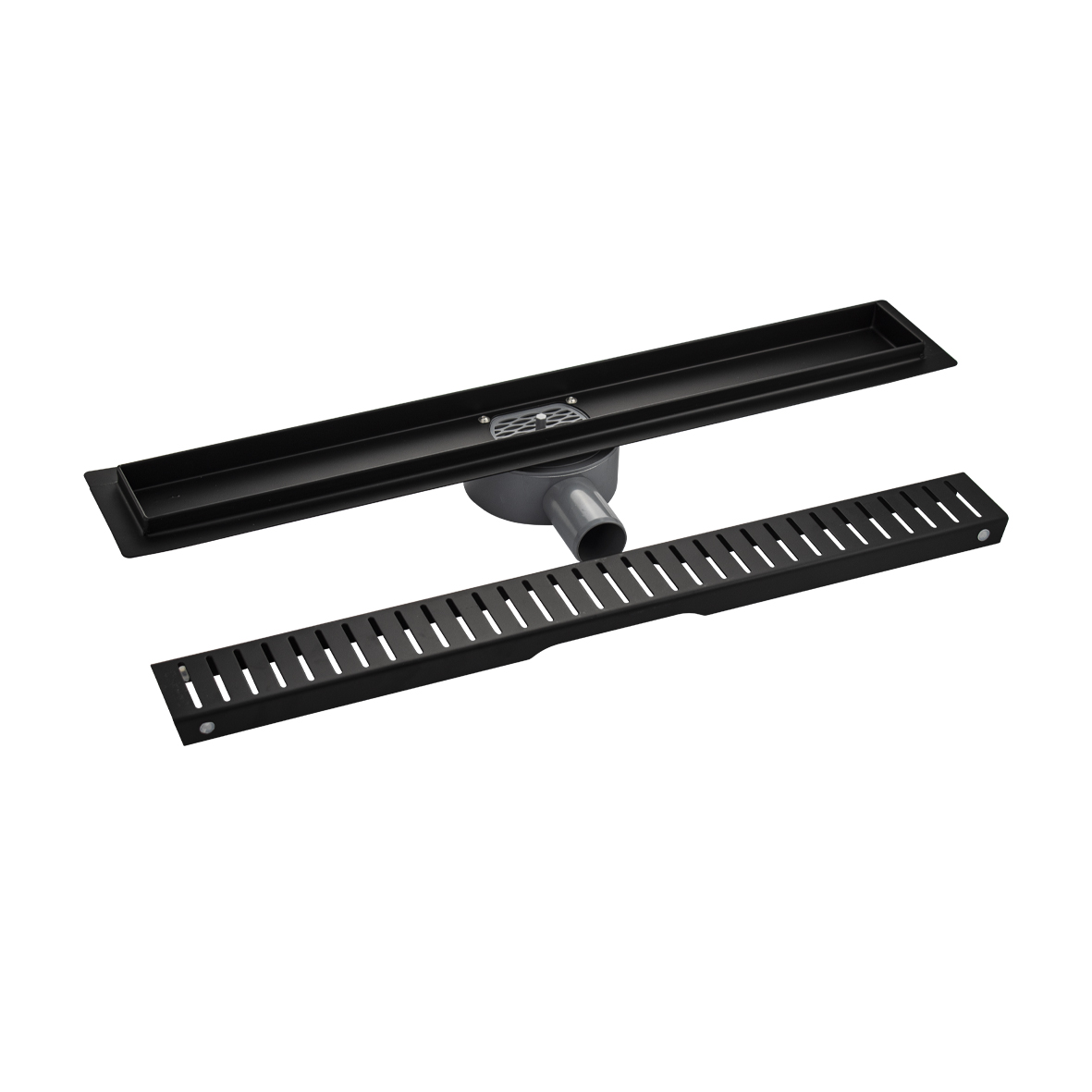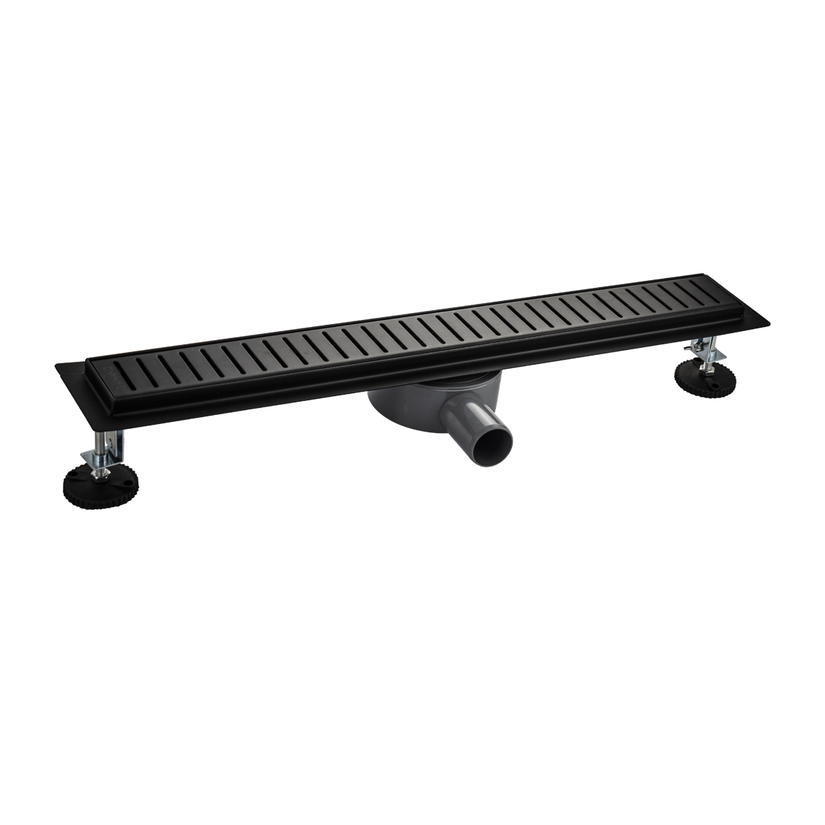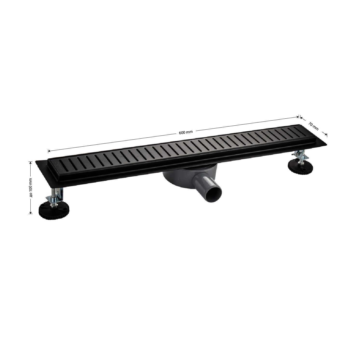 Душевой сливной трап из нержавеющей стали, чёрного цвета, линейный, горизонтальный с сухим затвором, с регулируемыми ножками и бортиком под плитку с четырёх сторон – это специальный элемент сантехнических коммуникаций, предназначенный для отвода воды в систему канализации. Как правило, душевые трапы устанавливаются непосредственно в пол. Благодаря небольшим габаритам и высоте душевые трапы идеальны для установки в душевых зонах. Это важно для организации пространства, где нет возможности установить классическую ванну: в малогабаритных квартирах, студиях, совмещенных санузлах и т.п. Габаритные размеры: высота до 100 мм, ширина 70 мм, длина 600 мм, ширина бортика 20 мм, выход в канализацию 50 мм. В комлекте идут регулируемые ножки высотой до 10 мм от пола, вращающийся слив на 360°. Вес - 2,50 кг, объём - 0,01082 м3.