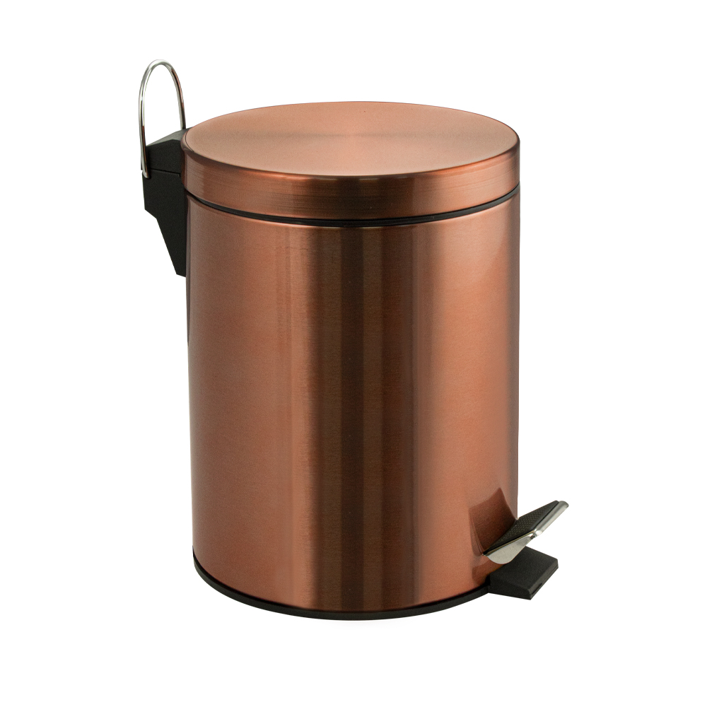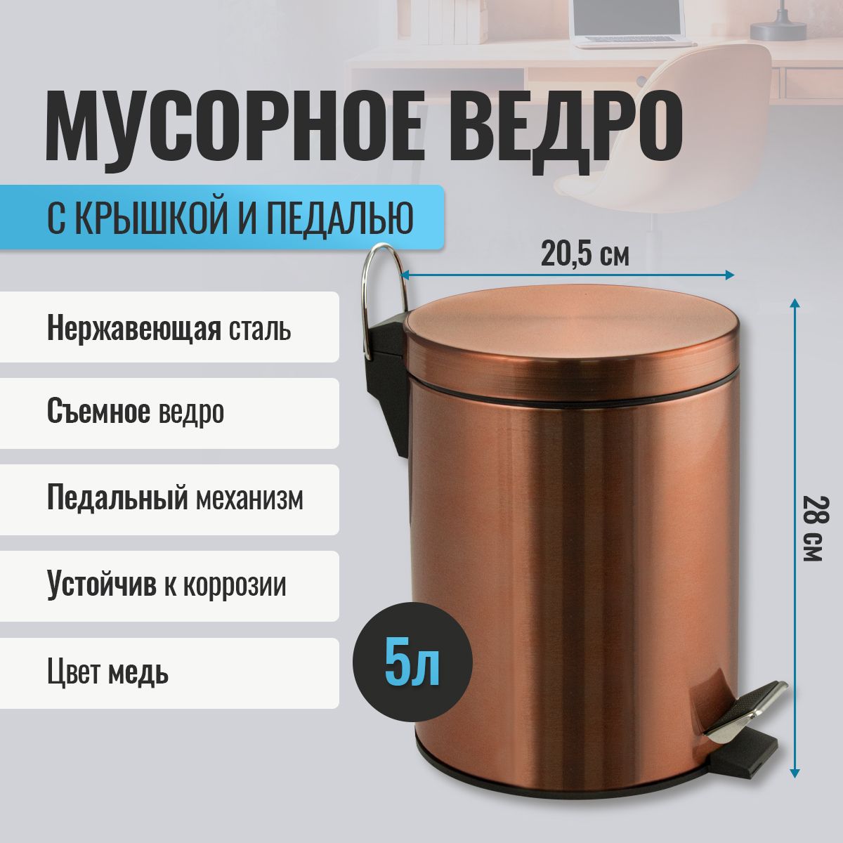 Круглое ведро, цвета медь, для хранения мусора с педалью и откидной крышкой прекрасно подойдет для ванной комнаты, туалета или кухни и офиса. Ведро оснащено пластиковым гигиеническим контейнером с металлической ручкой для переноса и механизмом поднятия крышки, при помощи нажатия на педаль. Объём ведра 5 литров. Отличное решение для утилизации мелкого бытового мусора. Наличие крышки обеспечивает защиту от неприятных запахов и распространения бактерий, а педальная система открывания позволяет не прикасаться к баку руками. Благодаря современному дизайну ведро впишется в интерьер любой кухни и ванной комнаты. Преимущества ведра для мусора с педалью: удобно устанавливается и перемещается на любое место; изготовлено из устойчивой к коррозии нержавеющей стали с покрытием под мед, глянцевое; пользоваться изделием удобно и гигиенично благодаря педали в нижней части корпуса. Нескользящая пластиковая основа ведра предотвращает повреждение пола. Габаритные размеры: высота 280 мм, диаметр 205 мм. Вес - 1,000 кг, объём -