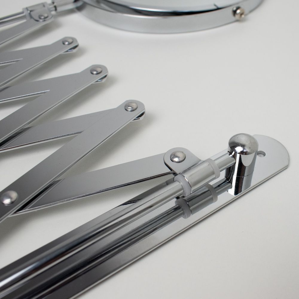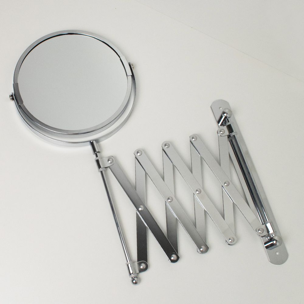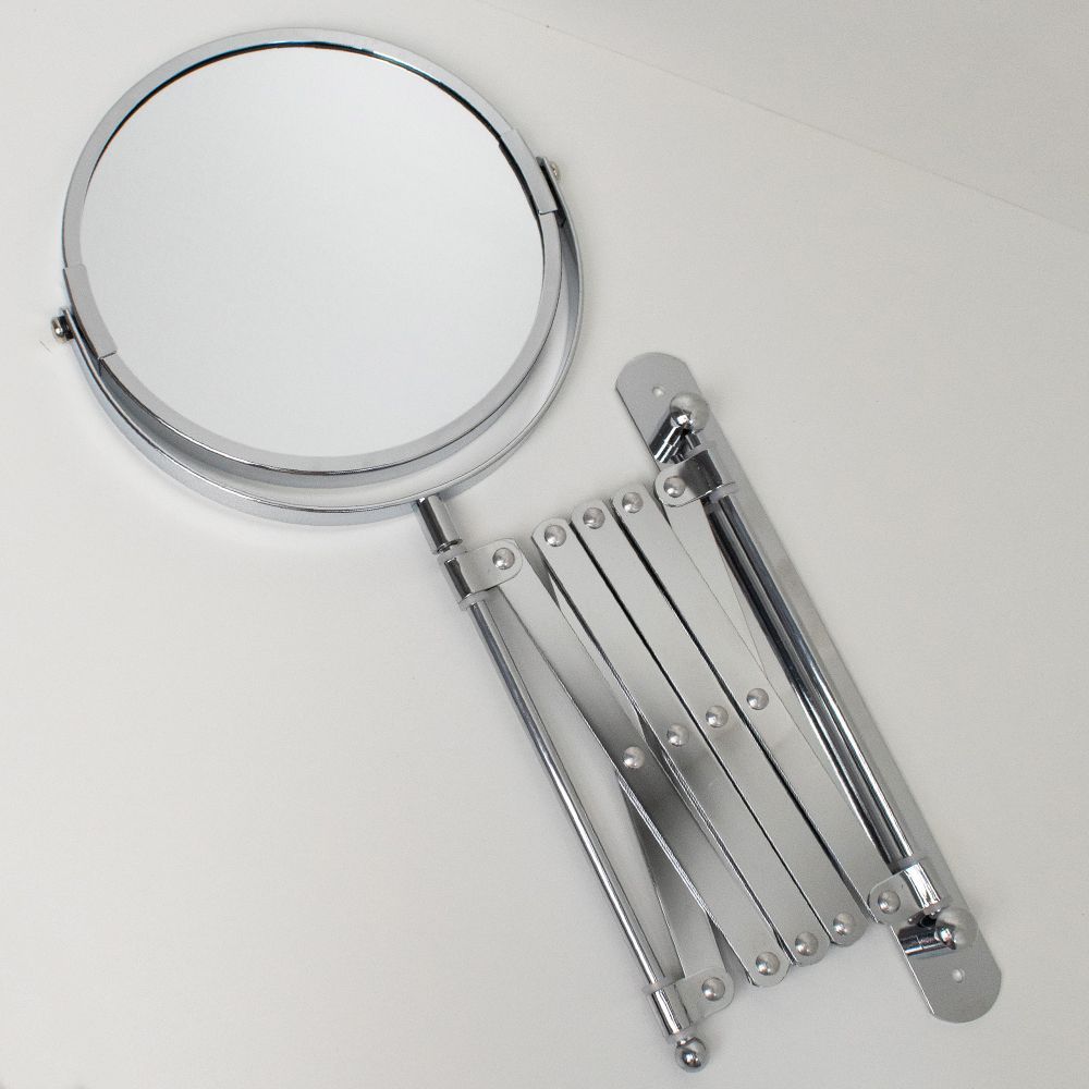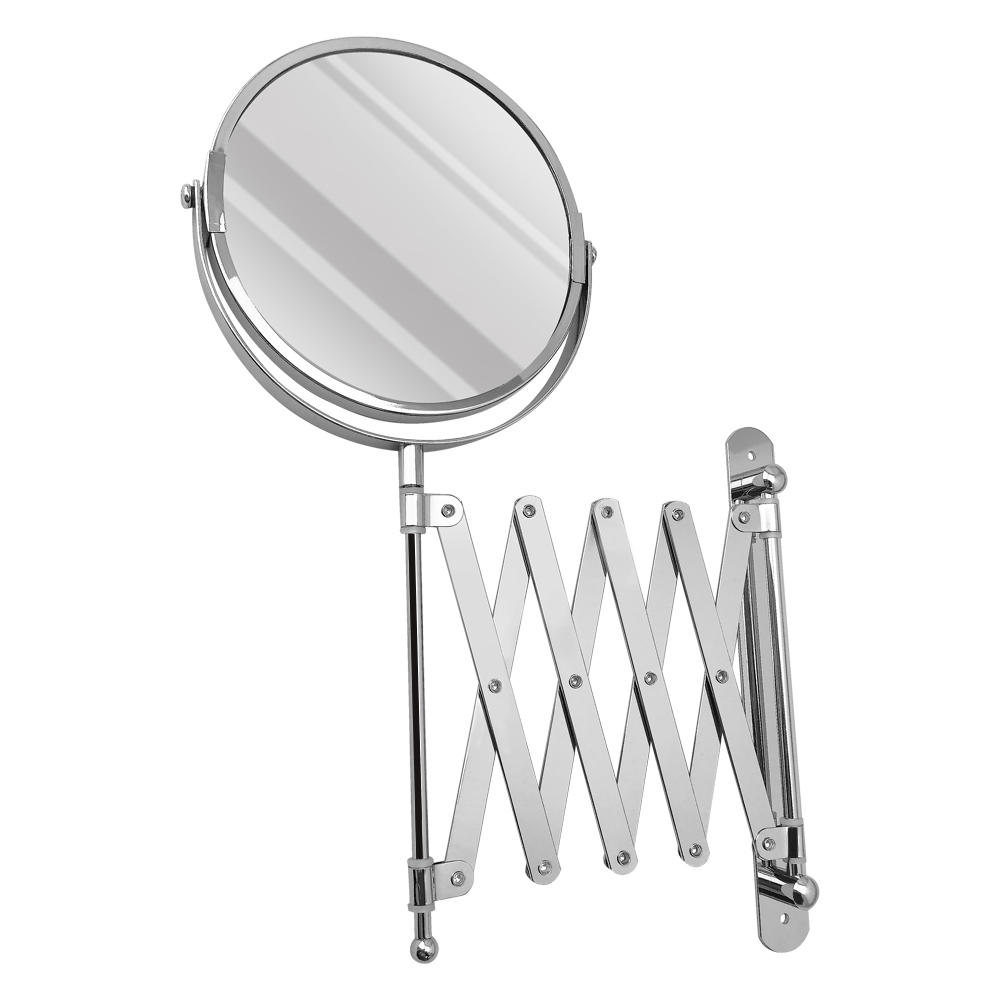 Зеркало настенное, косметическое, раздвижное, двустороннее, с увеличительным эффектом. Изготовлено из прочной нержавеющей стали с хромированным покрытием, которое придает безупречный стильный вид и долговечность. Хромированное покрытие очень стойко переносит истирания и обеспечивает зеркальный блеск изделия. Установлено на металлический хромированный держатель, позволяющий поворачиваться вокруг своей оси и регулировать угол наклона модели. Снабжено механизмом «гармошка», которое позволяет зеркалу выдвигаться на требуемое расстояние и компактно складываться. Одна из сторон зеркала имеет 3х-кратное увеличение удобное для косметических процедур, нанесения макияжа и бритья. Монтируется к стене при помощи крепления, входящего в комплект. Габаритные размеры: диаметр 135 мм, высота 340 мм, длина от 100 до 600 мм. Вес - 0,800 кг, объём - 0,00320 м3.