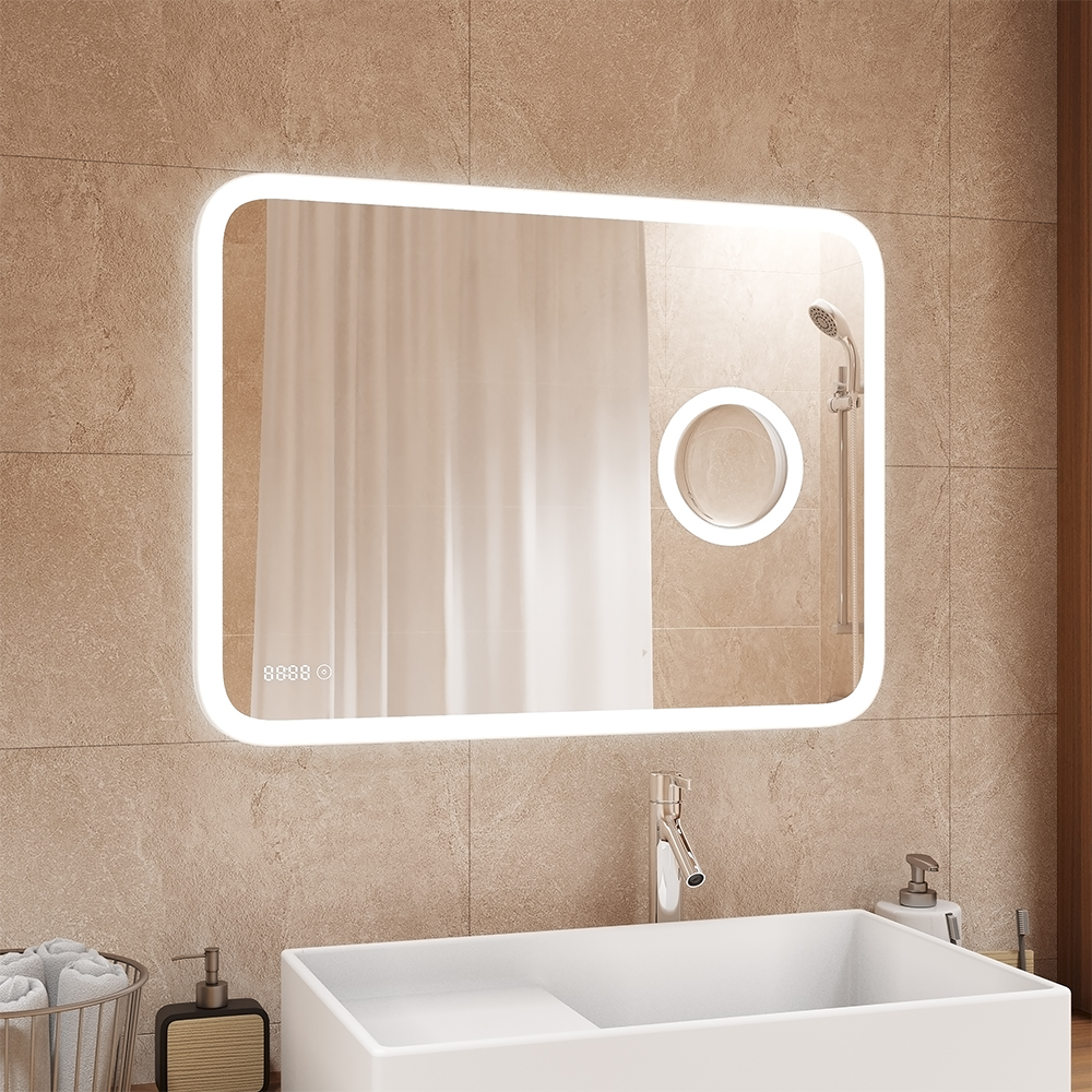 Зеркало с внутренней ЛЭД подсветкой + 3 х кратная линза + часы, прямоугольное, сенсорное, с пескоструйной обработкой, изготовлено из влагостойкого зеркального полотна толщиной 4 мм производства. Корпус изготовлен из высокопрочного пластика АБС Источник света скрыт за зеркальной поверхностью, световое зеркало представляет собой идеальное сочетание стеклянной поверхности и глубокой игры света. Край полотна обработан для защиты от порезов при контакте. Питание от сети 220В, сенсорный выключатель, температура свечения ЛЭД - 6000К, светодиоды - 2835 (120), 220 В / 50 Гц. Управление подсветкой осуществляется сенсорным выключателем. Срок службы диодов - 30000 часов. ЛЭД подсветка зеркала имеет нейтральный оттенок белого свечения. Изделие прошло обязательную сертификацию и может использоваться в помещениях с повышенной влажностью воздуха. В комплект поставки входит крепеж. Габаритные размеры: высота 700 мм, ширина 1000 мм. Вес - 10,200 кг, объём - 0,03937 м3.